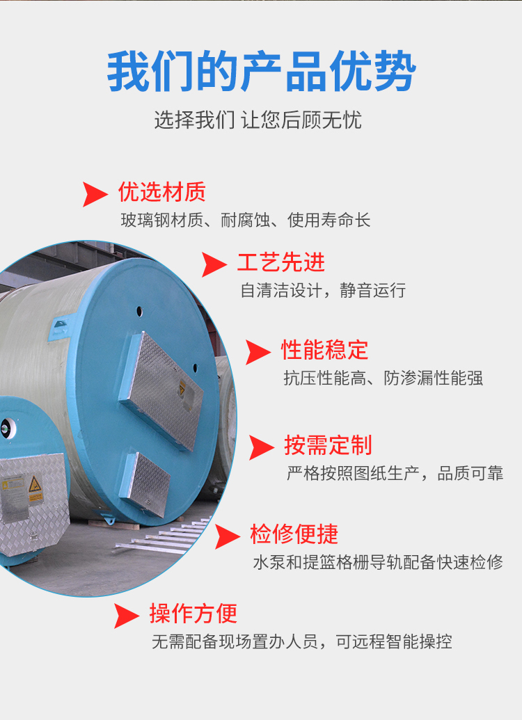 玻璃鋼一體化泵站是一款專為解決城市雨水收集和排澇以及城鎮污水提升而設計的新型污水處理設備。泵坑設計帶有一體化的排放連接。泵站為地埋式、泵站主體由泵站筒、潛水泵、耦合裝置、管道、閥門、液位傳感器、控制系統、粉碎型格柵和通風系統等部件組成。是一種使用方便,質量可靠,土建工作少,成本較低的新型一體化泵站設備,容積優化是其顯著的特征,可以作為中小型混凝土泵站的替代品。